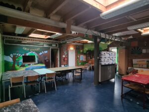 Het gebouw komt je binnen door een gang met aan de linkerkant twee toiletten en een douche. Ook zijn er in de gang twee wasbakken aanwezig. Aan het eind van de gang kom je in de open ruimte. En dit maakt het gebouw zo speciaal, want met behulp van schuifwanden kun je het gebouw indelen naar je eigen wensen. Je kunt zo bijvoorbeeld een klein lokaaltje creëren of de ruimte in twee gelijke ruimtes indelen.